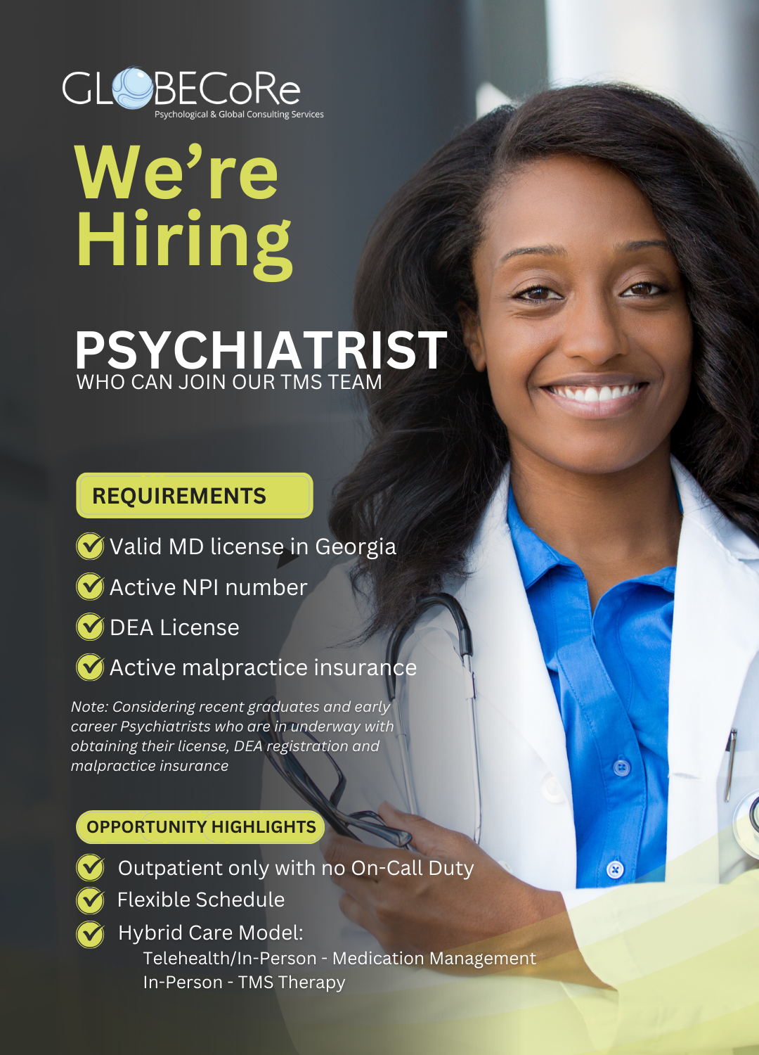 An Exciting Opportunity Join Our Team of Visionary Psychiatrists at GlobeCoreIf you’re a psychiatrist or final year resident who’s interested in neuromodulation and advancing comprehensive psychiatric care for the public, then we want to work with you. We’re looking for someone to join our team and help more patients through Transcranial Magnetic Stimulation (TMS) and comprehensive psychiatric care that is quality based.